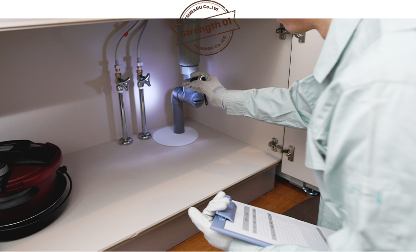 施工不良や漏水など、工事後のトラブルが決して起きないよう、日ごろより常に髙いパフォーマンスで施工を行い、細かい確認作業を徹底しております。